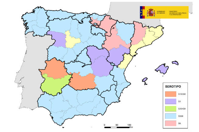 En la actualidad, solo en 5 provincias españolas no circula el virus de la legua azul. Desde la última actualización realizada por el MAPA, ha aparecido en Cuenca, en concreto el serotipo S3, además de que han aparecido nuevos serotipos en Cáceres S1, Badajoz S4, Guadalajara S8, Alicante S3 y