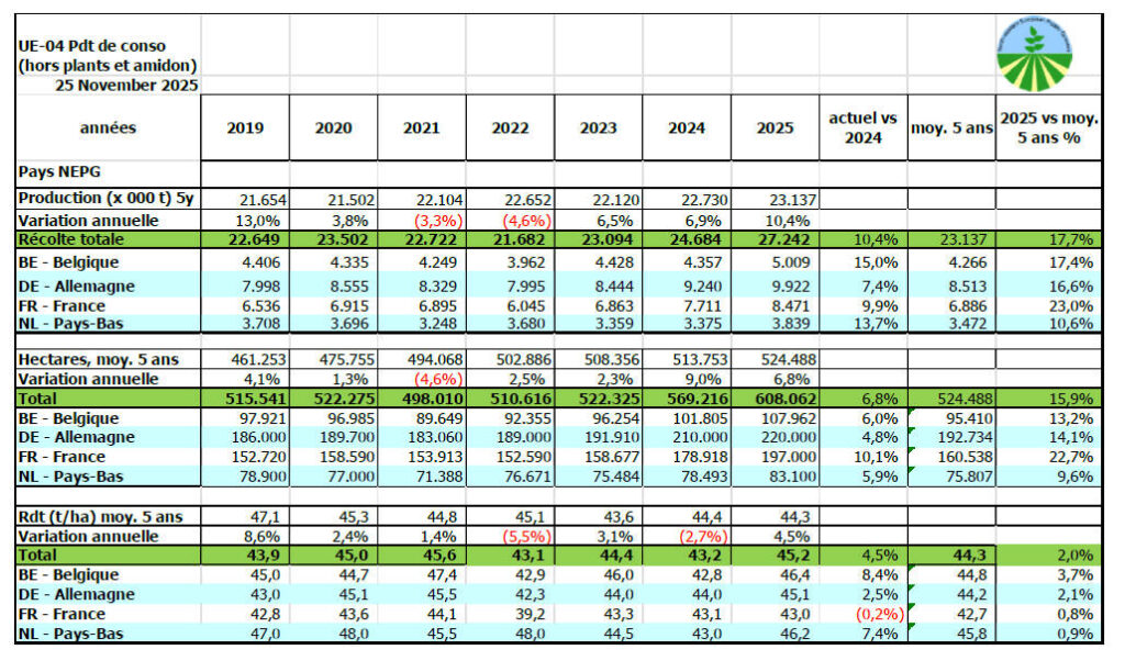 Los productores de patata de la zona NEPG (Bélgica, Alemania, Francia y Países Bajos) se preparan para una campaña excepcionalmente difícil, a pesar de registrar una cosecha elevada. Según los últimos datos de NEPG, la producción total de patata de consumo en 2025 ronda los 27,2 Mt, un 10% más que en 2024 y un 17,7% por encima de la media de los últimos cinco años.